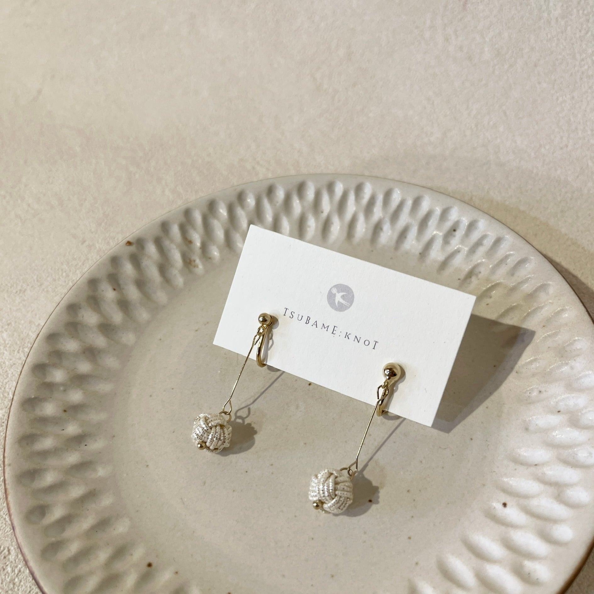 水引で淡路玉を結び、イヤリングにしました。淡路玉はパールのような見た目で、カジュアルな場所でもきちんとした場所でも使用でき、さりげなく耳元を彩ります。作家の手によって、一つ一つ丁寧に作り上げられています。